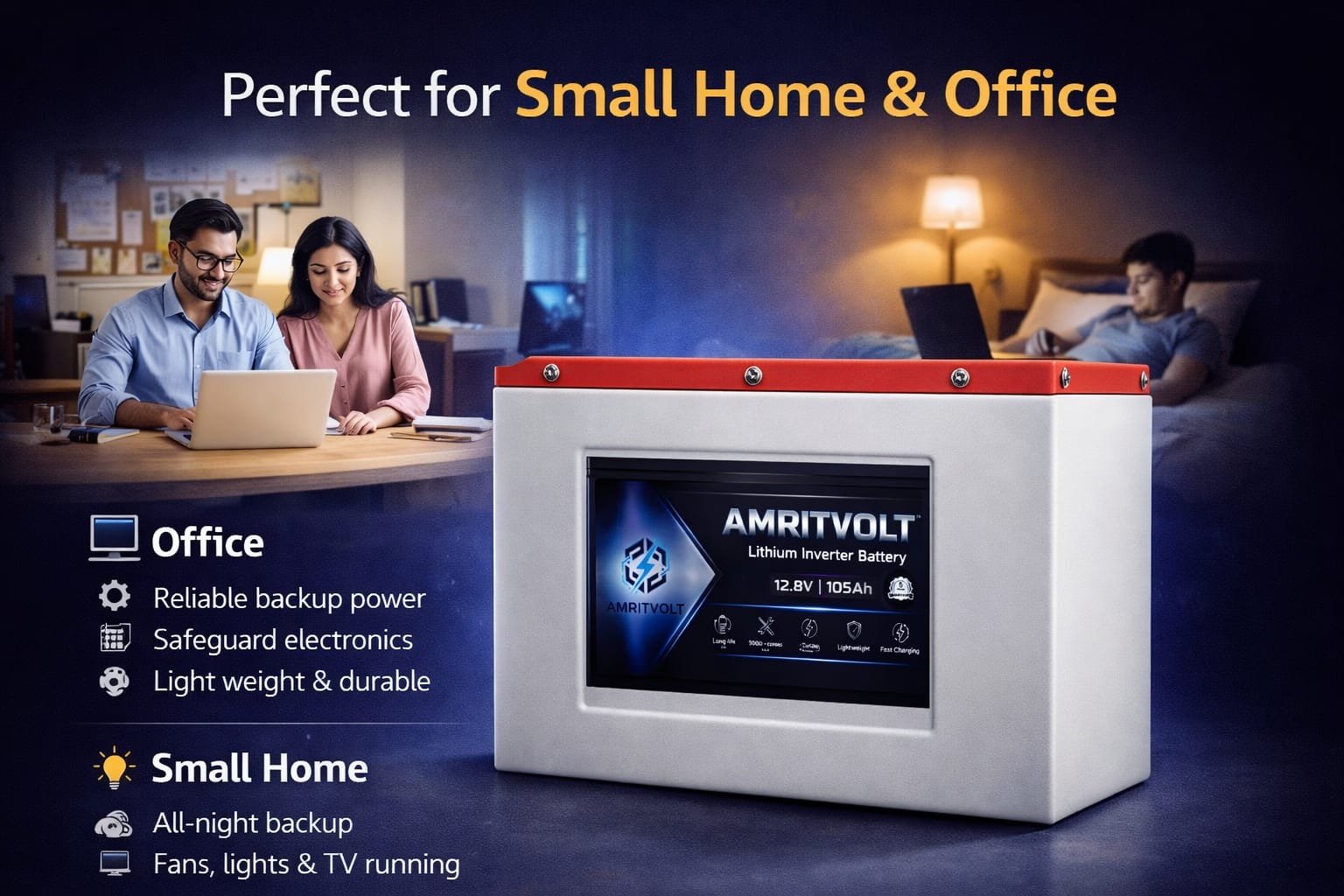 Designed to replace conventional lead-acid batteries, AmritVolt™ lithium systems provide longer lifespan, faster charging, higher efficiency, and intelligent battery management, making them ideal for modern power backup and energy storage needs.